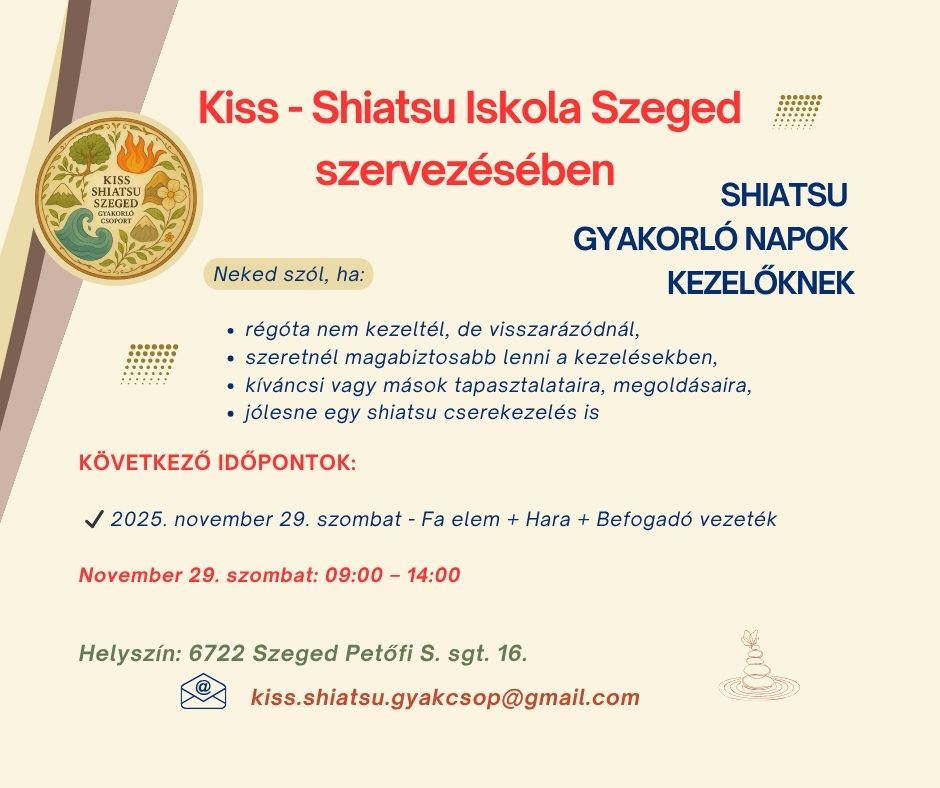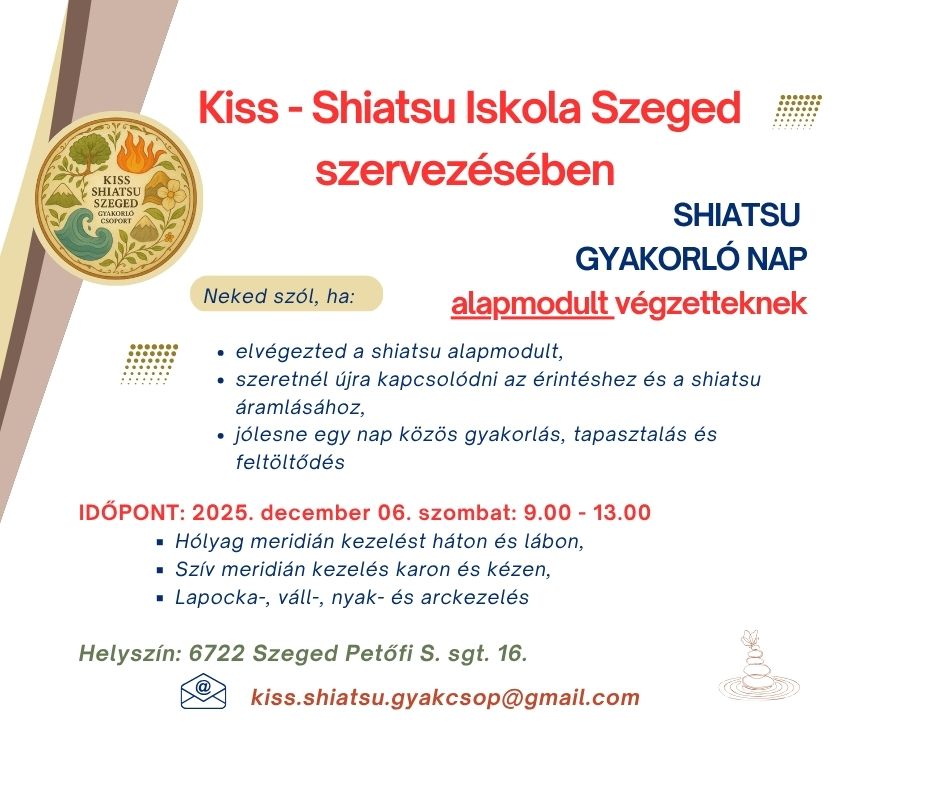Másik gyakorlási lehetőség 2025. december 6-án szombaton 9:00-13:00-ig lesz. Ezen az alkalmon csak shiatsu alapkezelést gyakorolunk, melyet a Kiss-Shiatsu Iskola szervezésében egyedül Gyenes Andrea vezet.